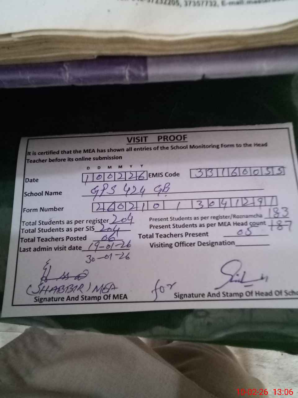 | Attendance Register | Head Teacher | MEA with School | Visit Proof |