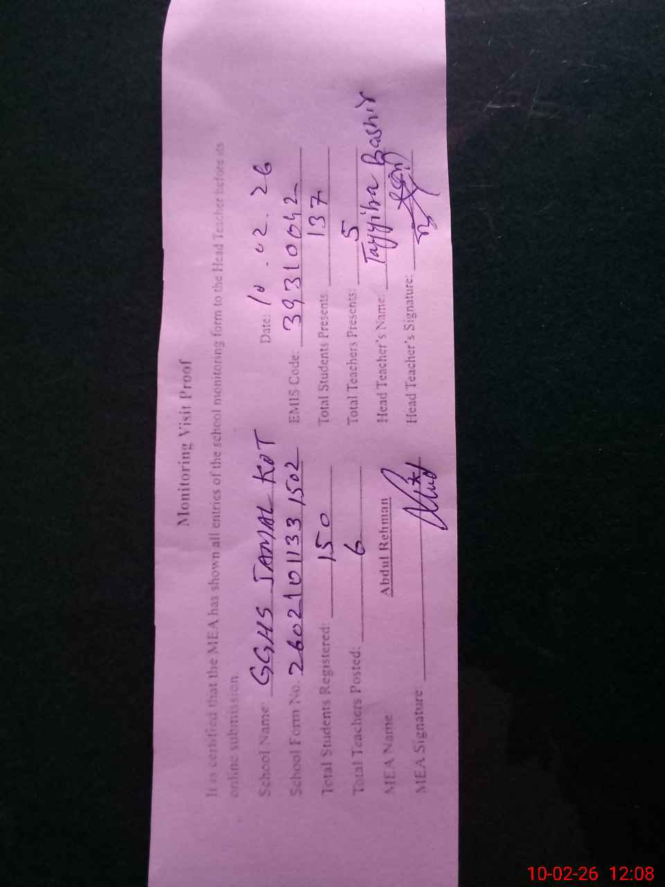 | Attendance Register | Head Teacher | MEA with School | Visit Proof |