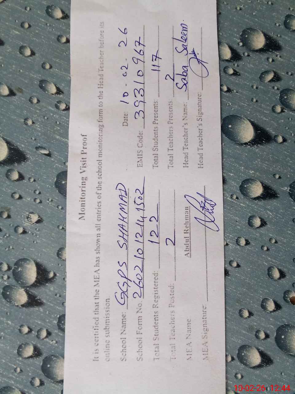 | Attendance Register | Head Teacher | MEA with School | Visit Proof |
