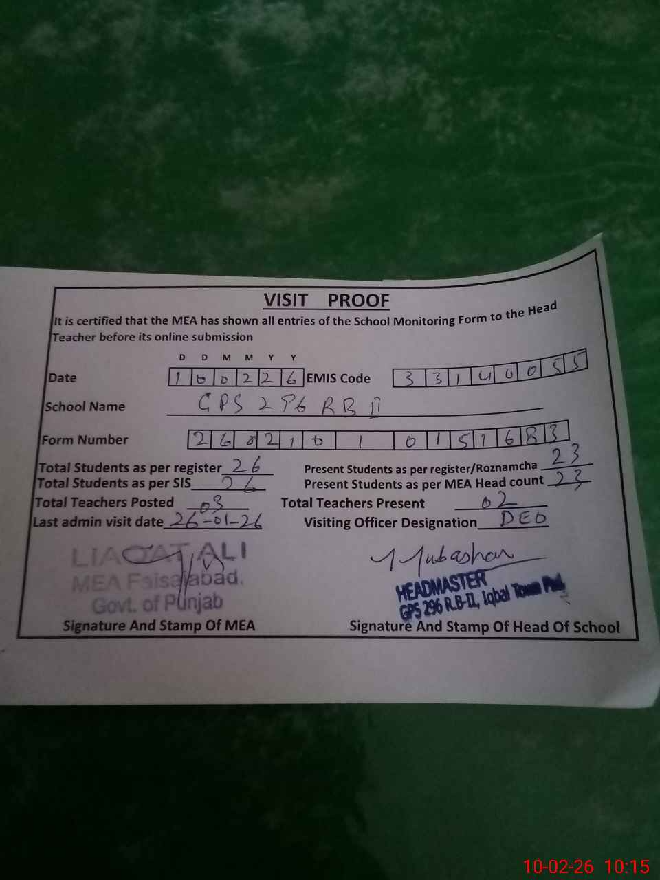 | Certified that this School was Inspected by the Undersigned MEA/DMO Today and the Information Stated Above is as Per Record. | |||||