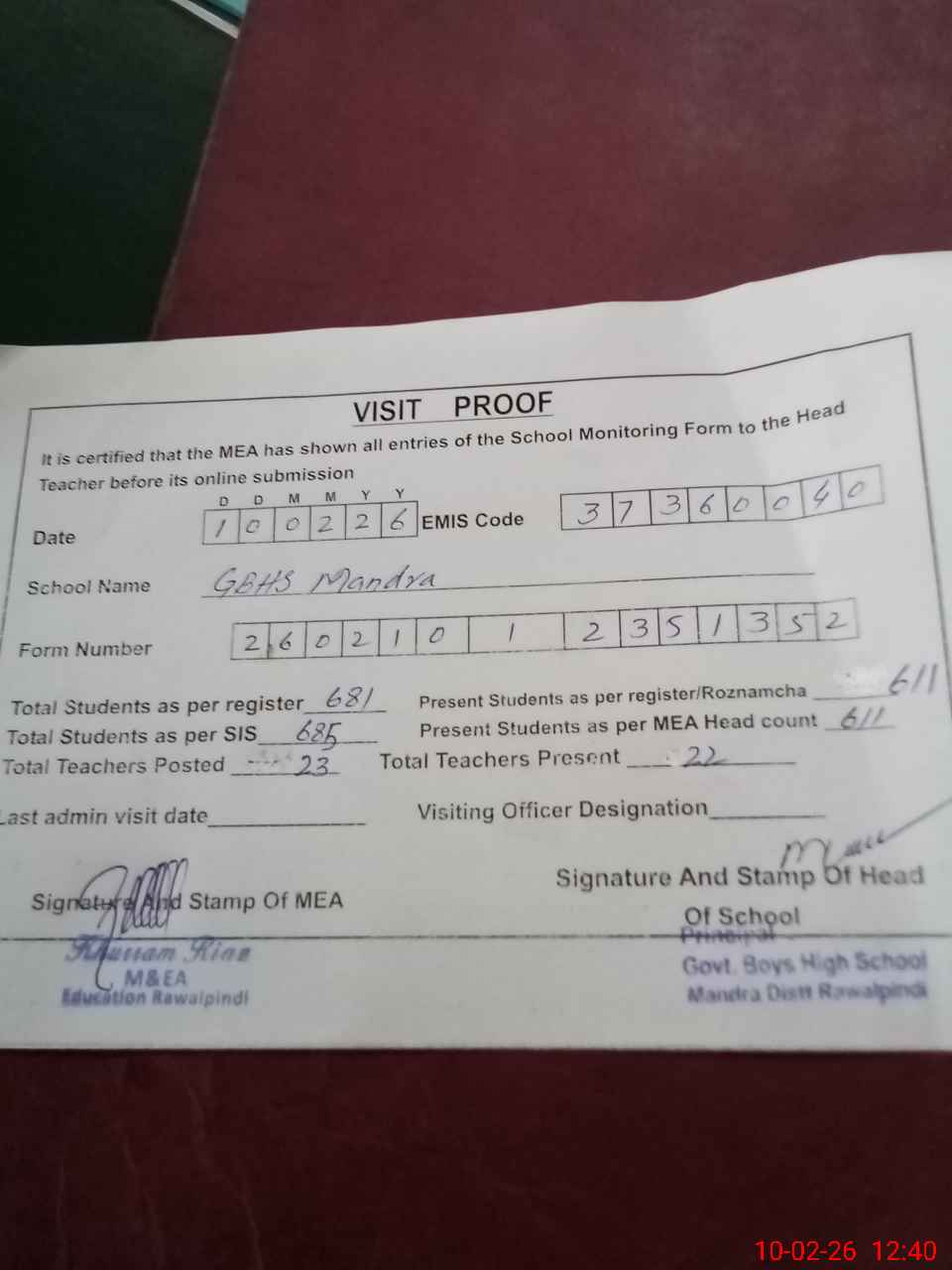 | Certified that this School was Inspected by the Undersigned MEA/DMO Today and the Information Stated Above is as Per Record. | |||||