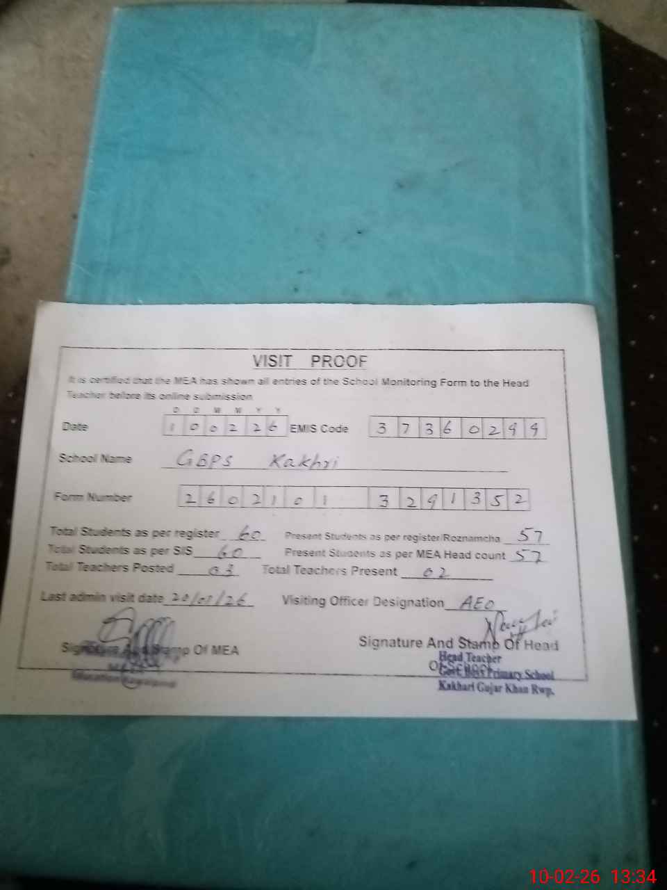 | Attendance Register | Head Teacher | MEA with School | Visit Proof |