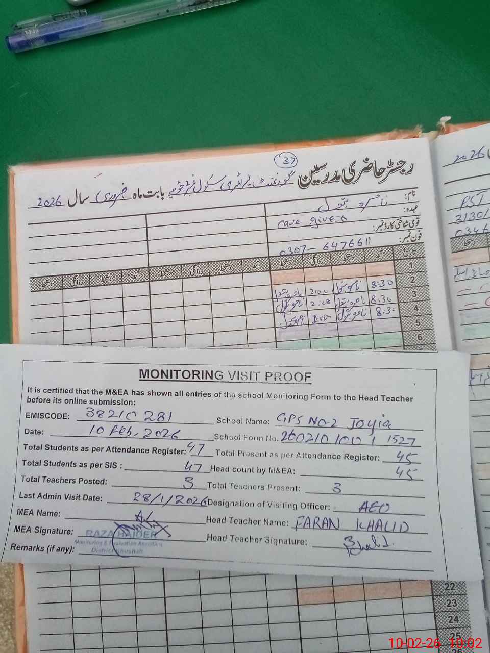 | EMIS Code: 38210281 | Name of School: GPS NO. 2 JOYIA | |||