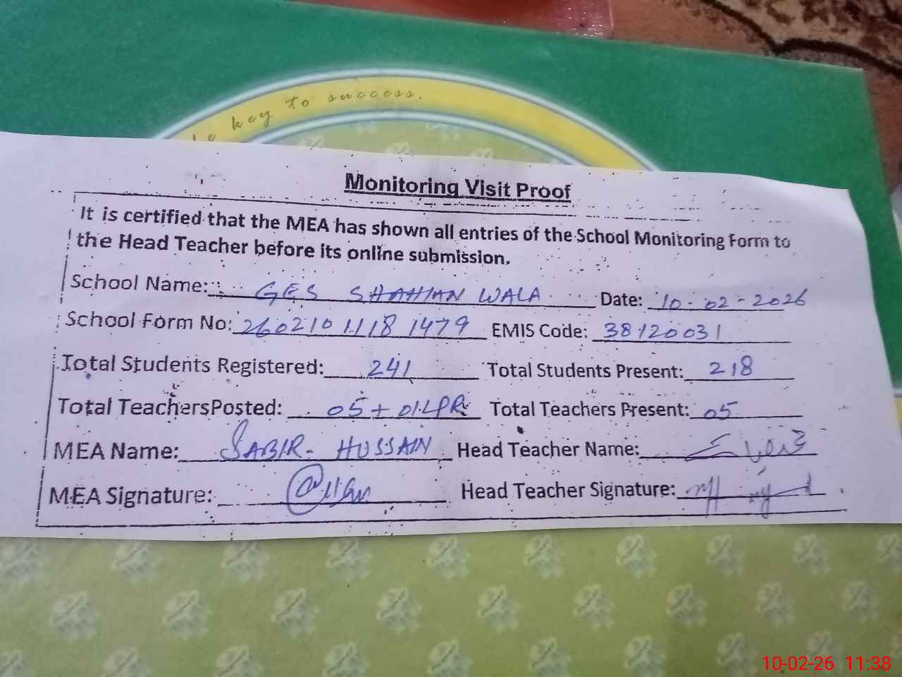 | EMIS Code: 38120031 | Name of School: GES SHAHIAN WALA | |||