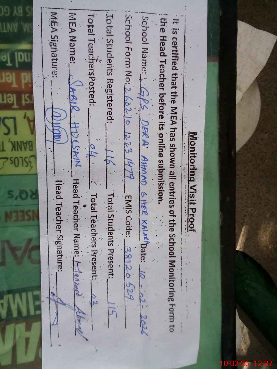 | Attendance Register | Head Teacher | MEA with School | Visit Proof |