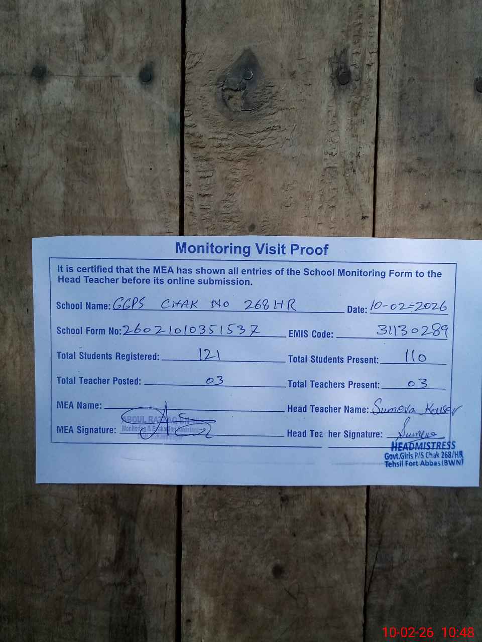 | EMIS Code: 31130289 | Name of School: GGPS CHAK NO 268 HR | |||