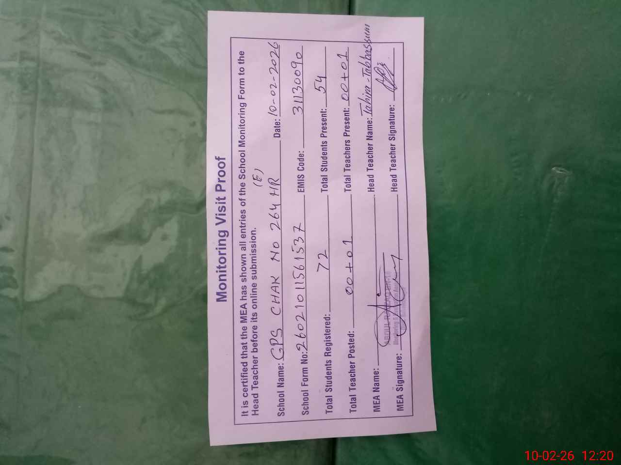 | Attendance Register | Head Teacher | MEA with School | Visit Proof |