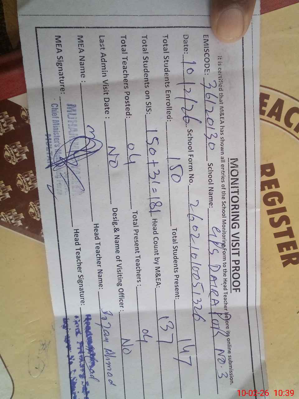 | EMIS Code: 36120130 | Name of School: GPS DAIRA PUR NO. 3 SHUJA ABAD | |||