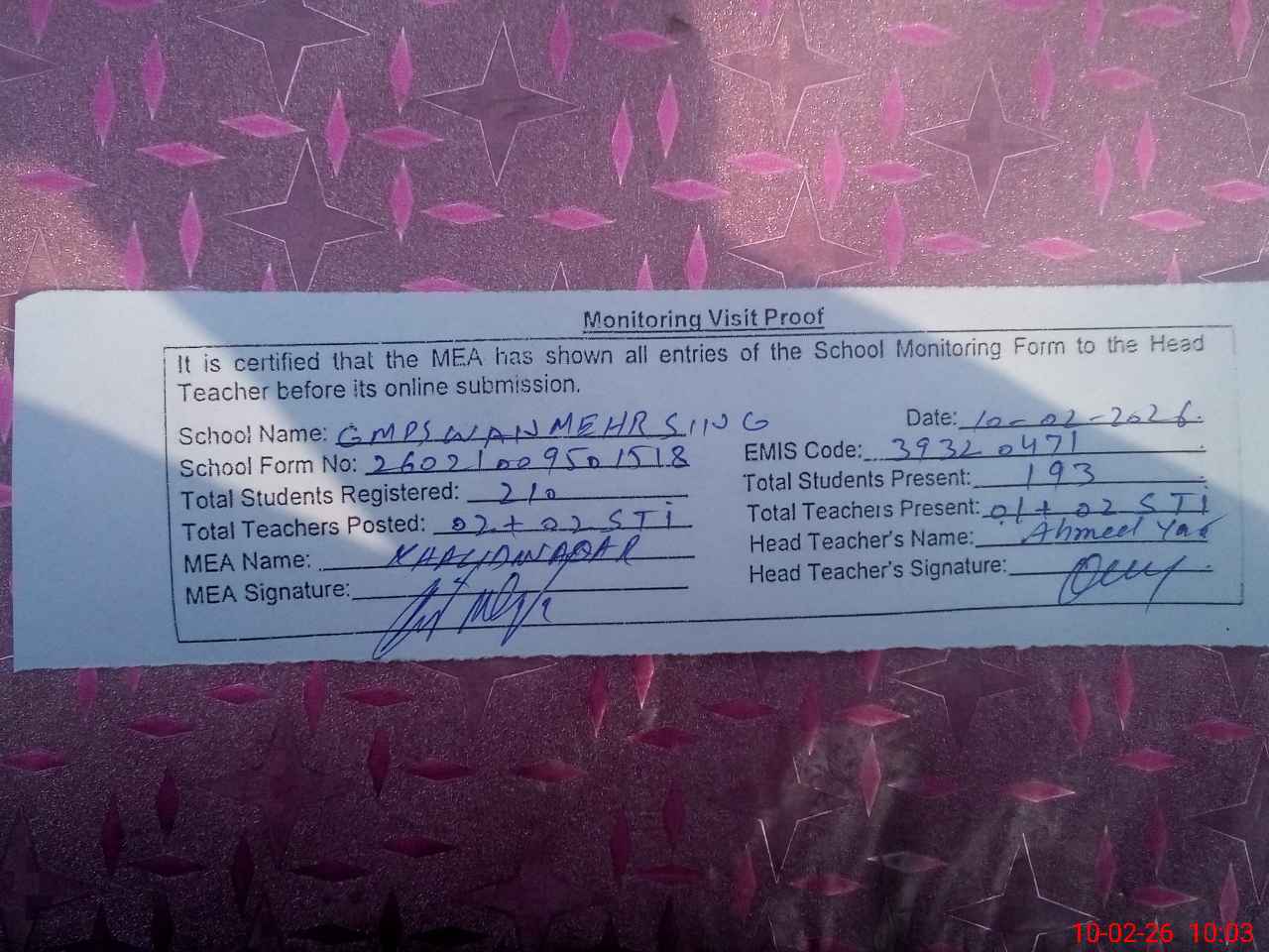 | EMIS Code: 39320471 | Name of School: GMPS WAN MEHR SINGH | |||