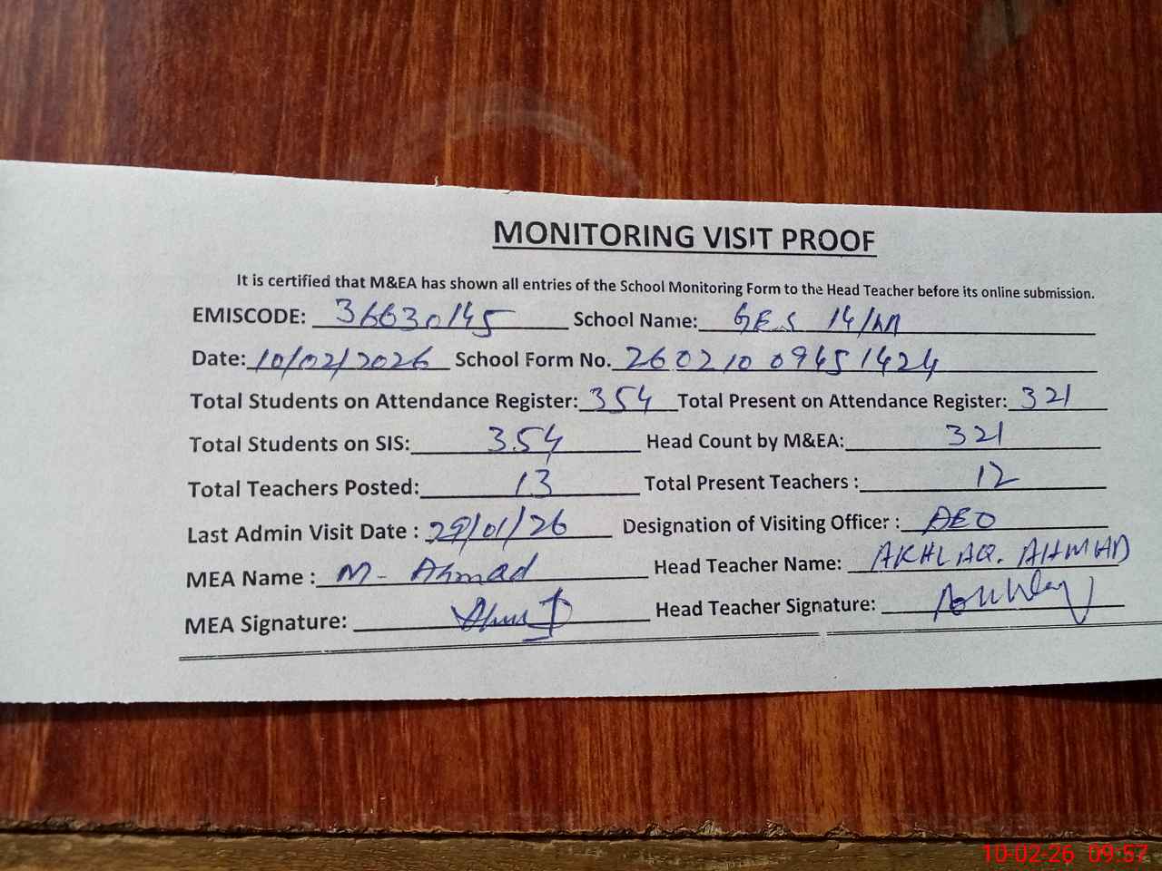 | Attendance Register | Head Teacher | MEA with School | Visit Proof |