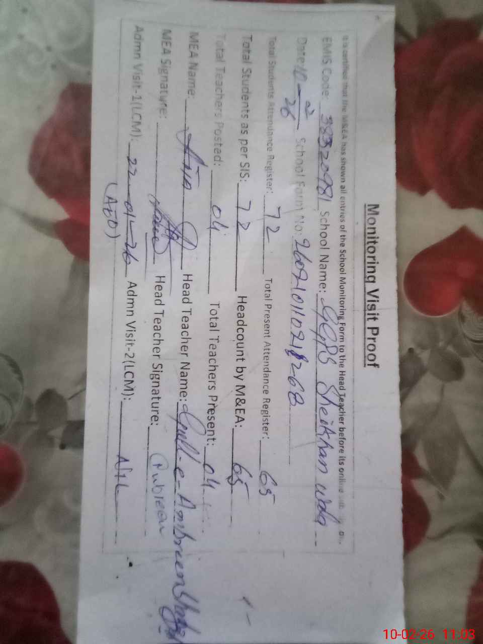 | Attendance Register | Head Teacher | MEA with School | Visit Proof |