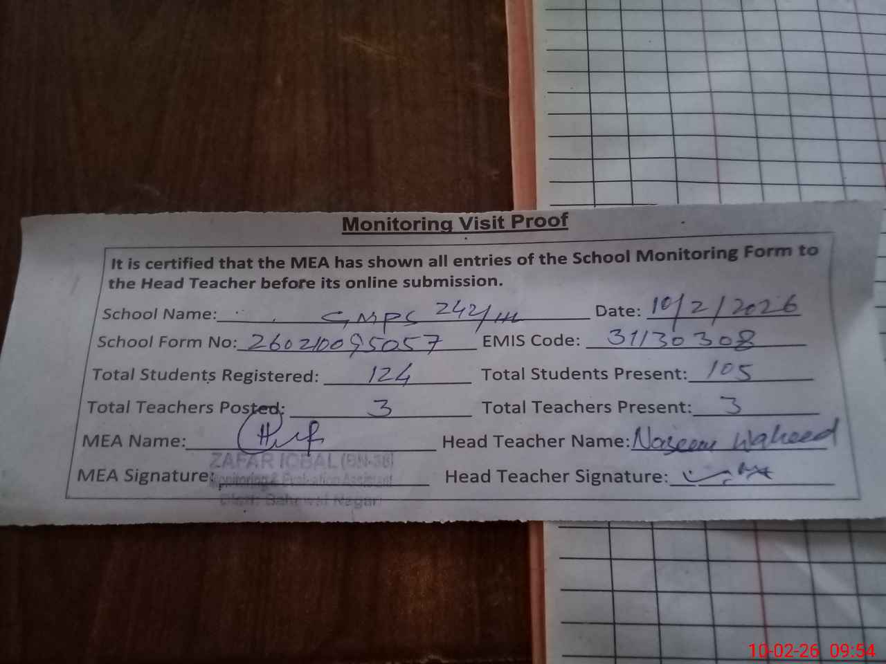 | Monitoring Date: 10-02-2026 | Start Time: 10-02-2026 09:33 AM | End Time: 10-02-2026 09:54 AM | Name of MEA: Za**** Iq**** BN**** | |