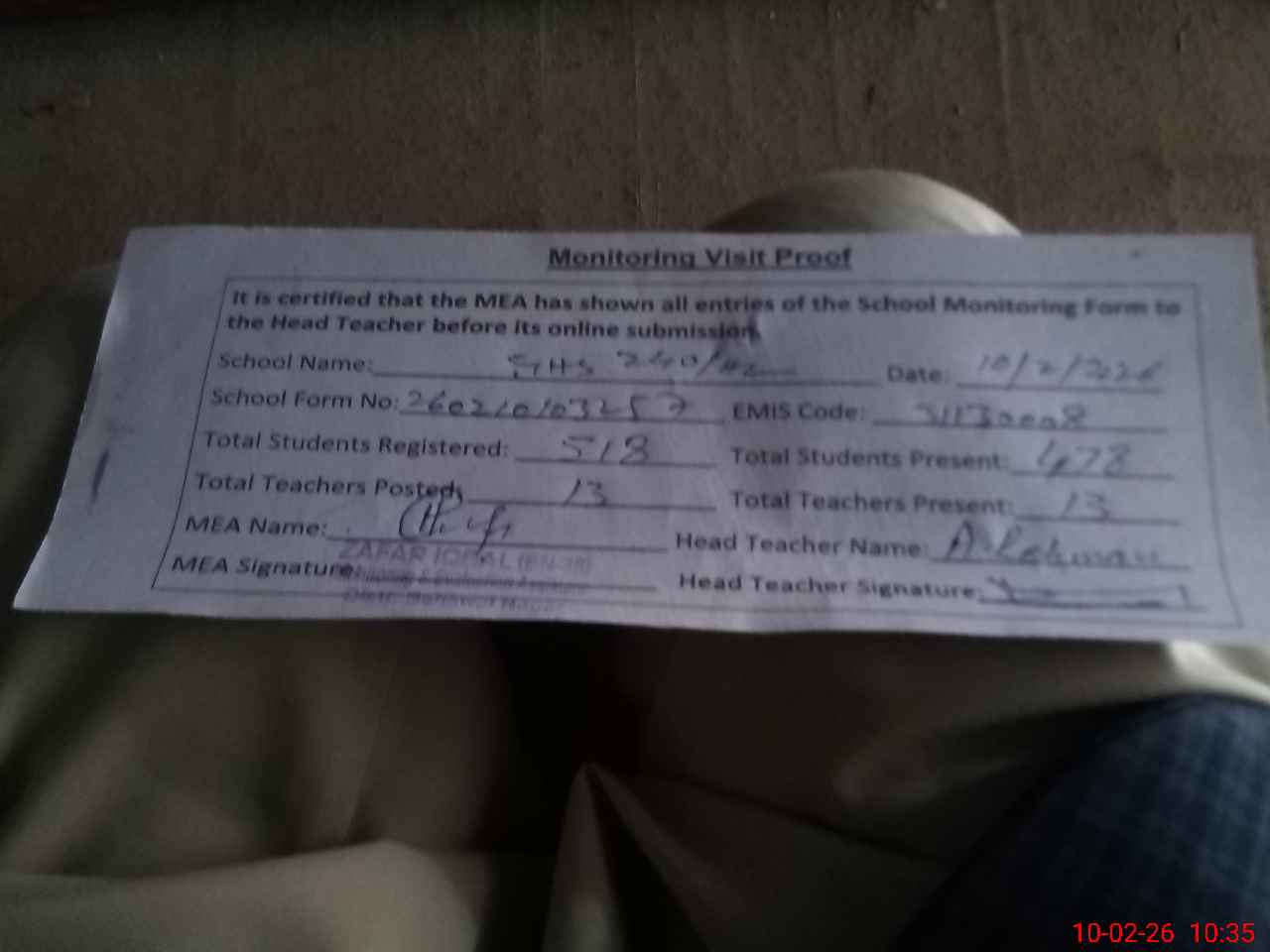 | Monitoring Date: 10-02-2026 | Start Time: 10-02-2026 10:09 AM | End Time: 10-02-2026 10:35 AM | Name of MEA: Za**** Iq**** BN**** | |