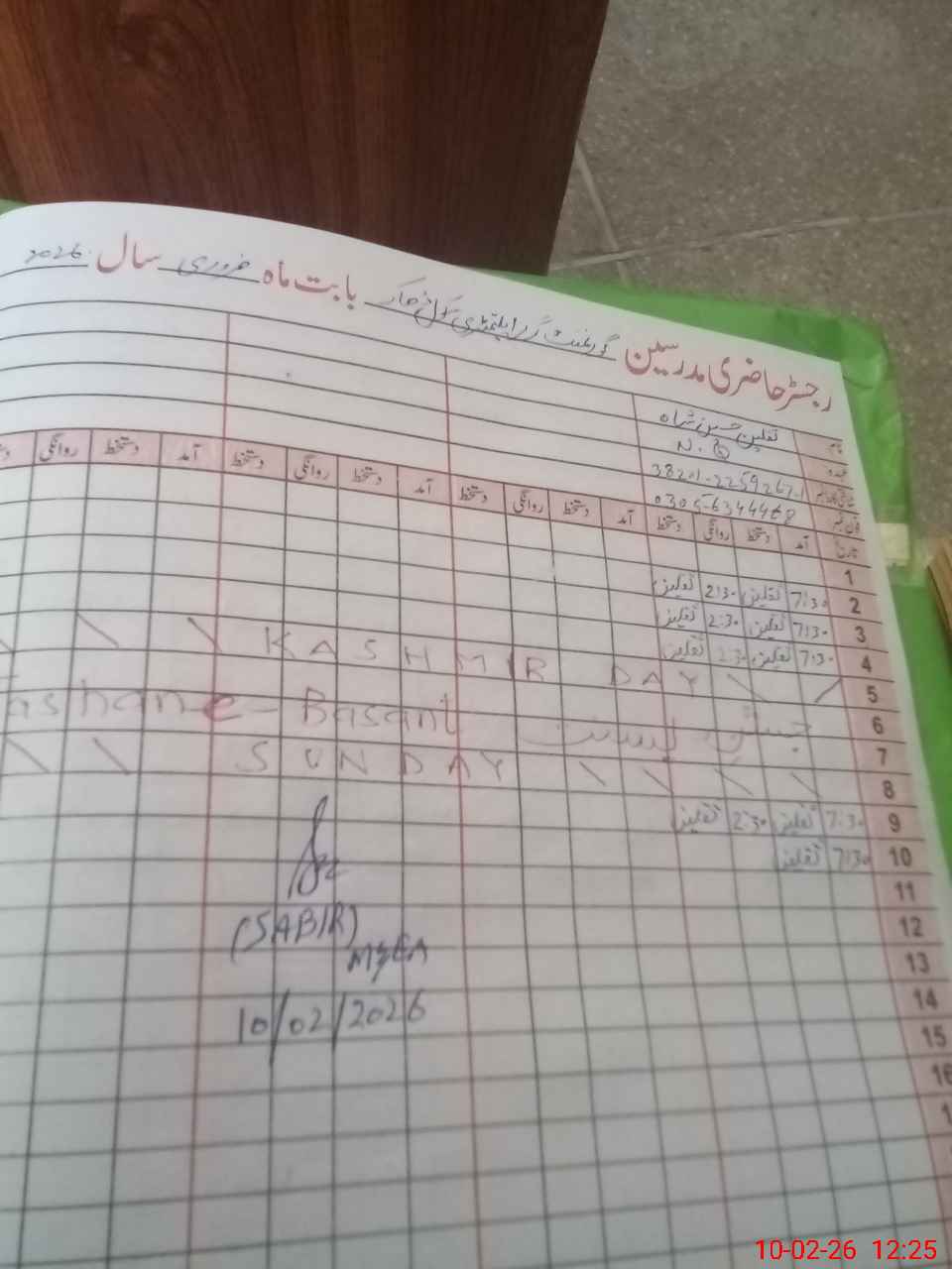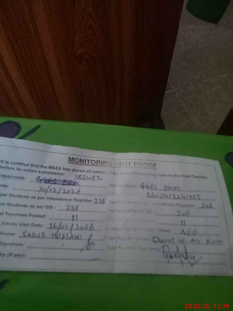 | Remarks (Use Separate Page if Required): no teacher absent total students on register 238 total students on SiS 238 last admin visit by AEO on 26 Jan 2026 | |||||