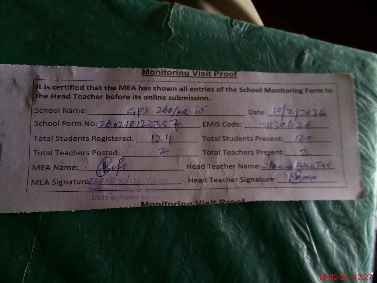 | Attendance Register | Head Teacher | MEA with School | Visit Proof |