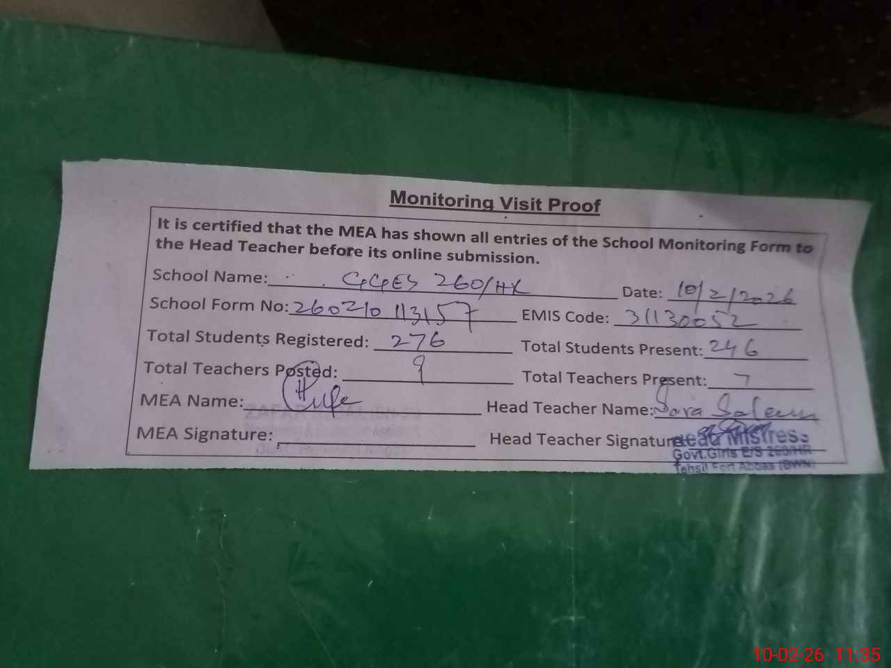 | Certified that this School was Inspected by the Undersigned MEA/DMO Today and the Information Stated Above is as Per Record. | |||||