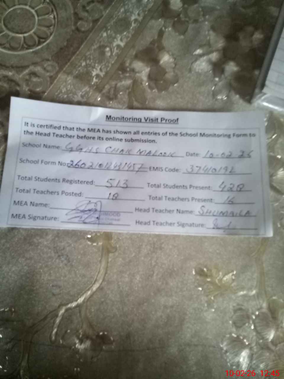 | Certified that this School was Inspected by the Undersigned MEA/DMO Today and the Information Stated Above is as Per Record. | |||||