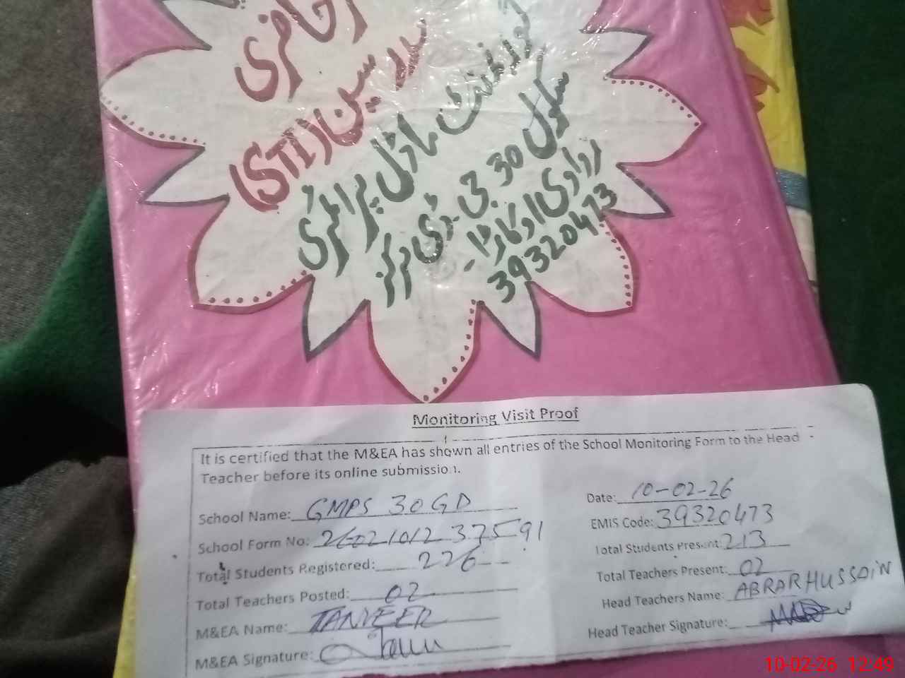 | Certified that this School was Inspected by the Undersigned MEA/DMO Today and the Information Stated Above is as Per Record. | |||||