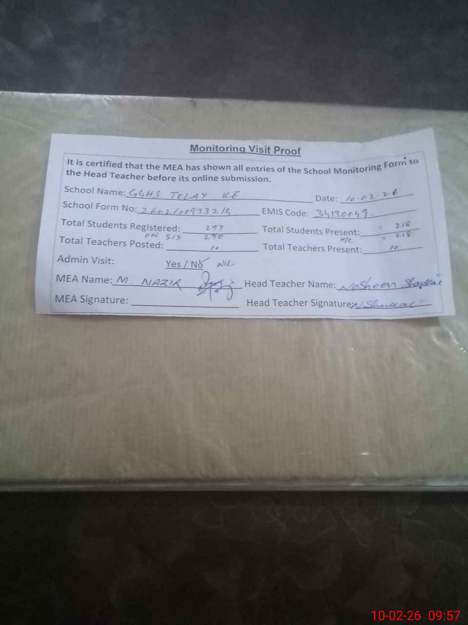 | Attendance Register | Head Teacher | MEA with School | Visit Proof |