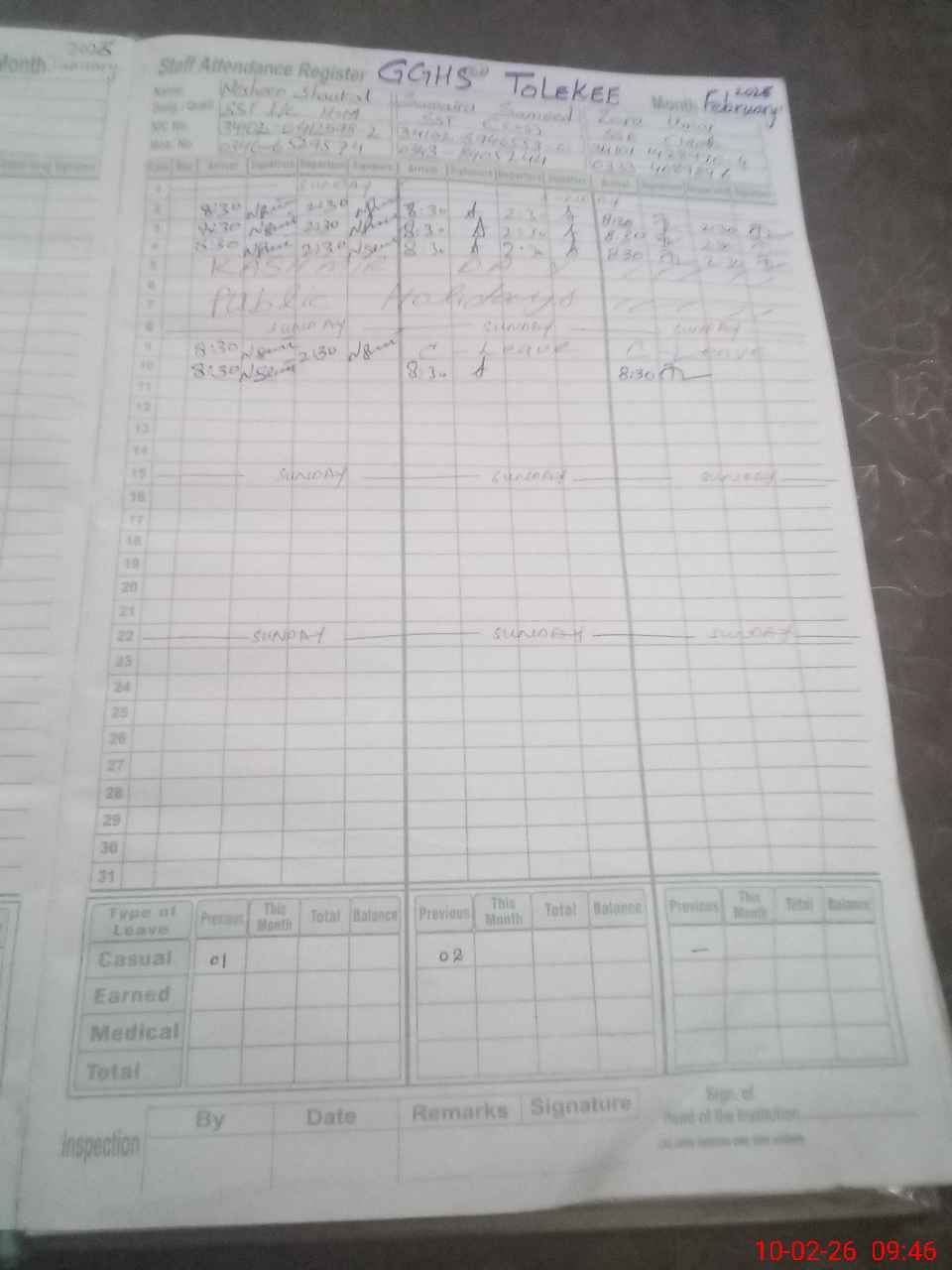 | CNIC | Full Name | Designation | R/C | Absence During Last Calender Month |