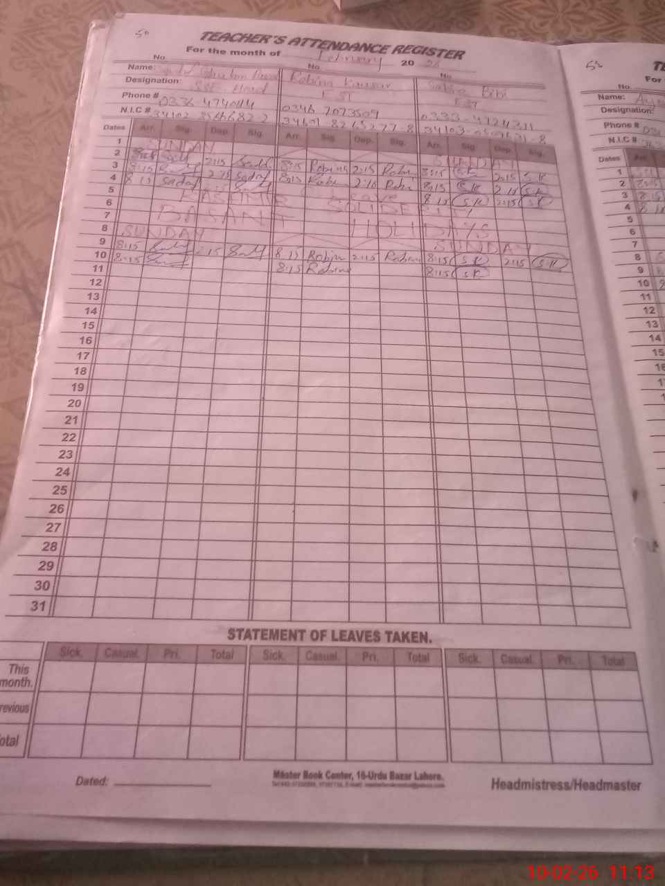 | CNIC | Full Name | Designation | R/C | Absence During Last Calender Month |