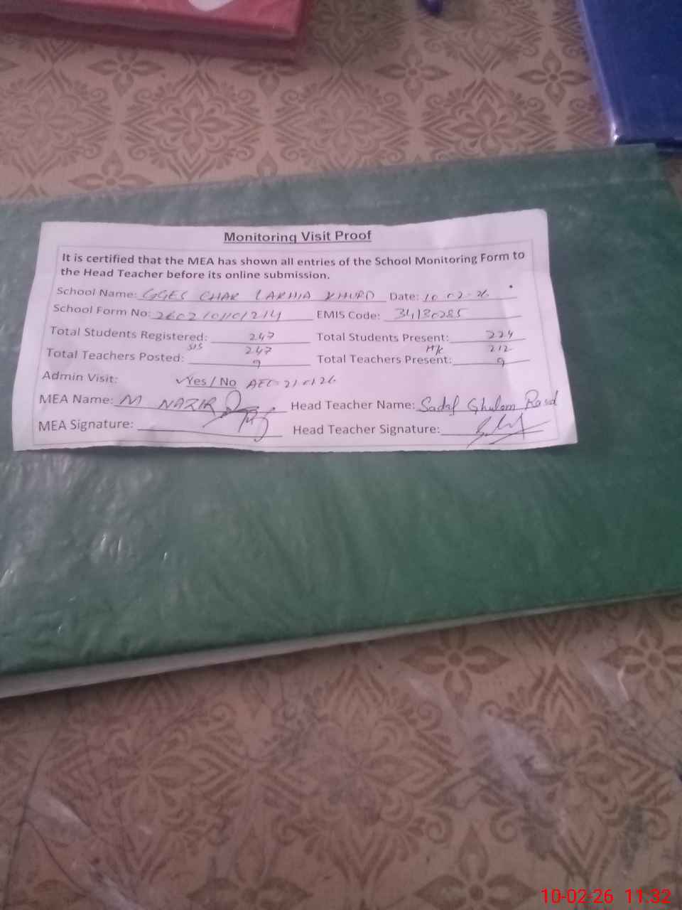 | Attendance Register | Head Teacher | MEA with School | Visit Proof |