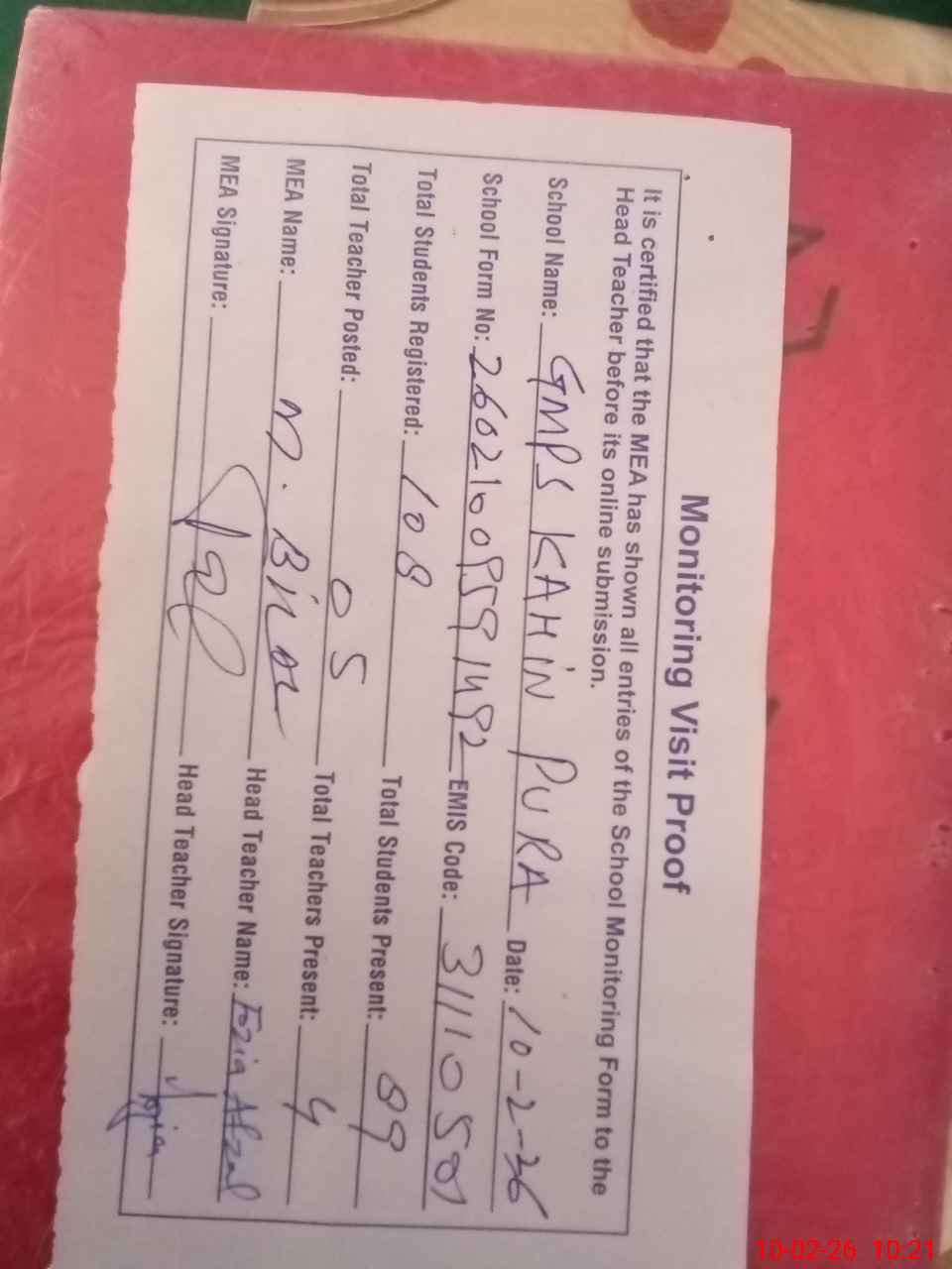 | EMIS Code: 31110501 | Name of School: GMPS KAHIN PURA | |||