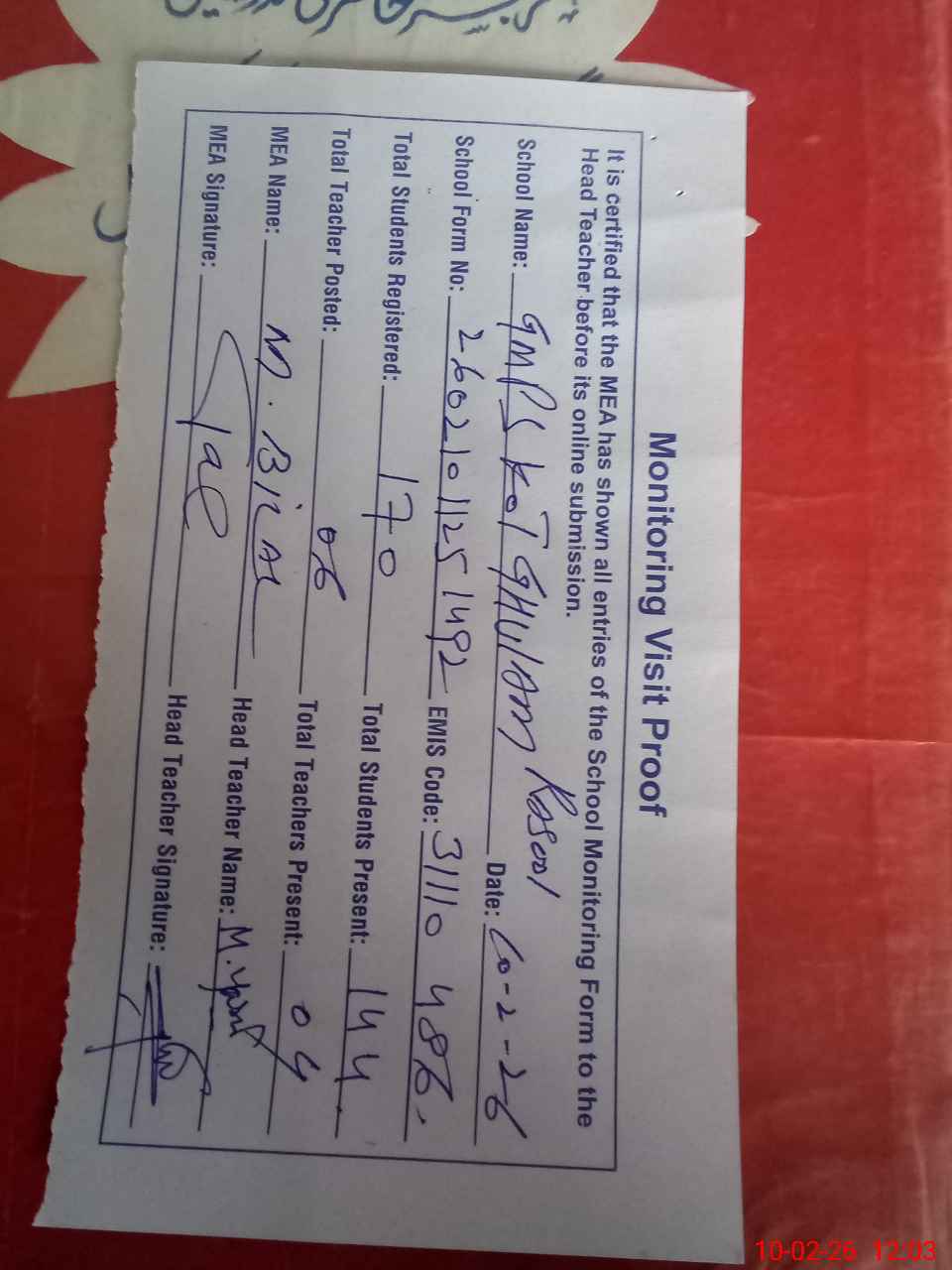 | Attendance Register | Head Teacher | MEA with School | Visit Proof |