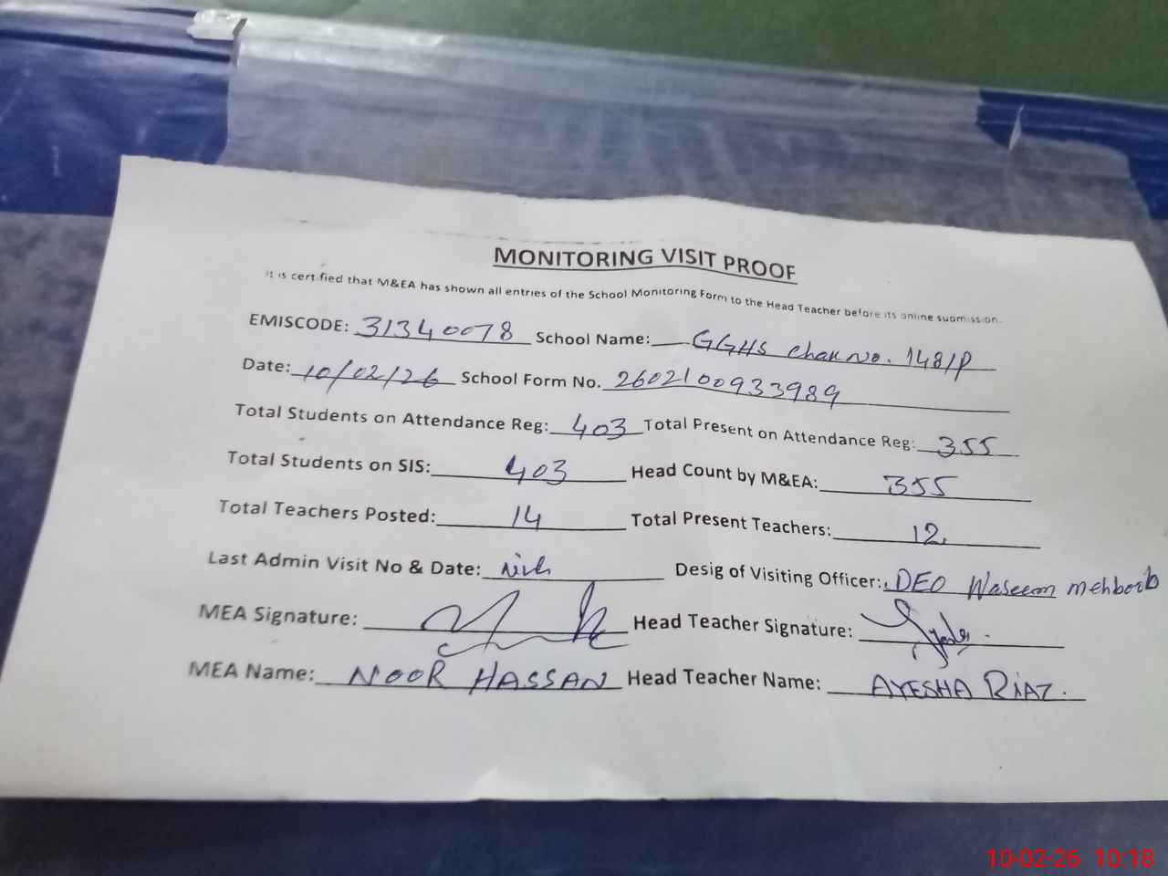 | Certified that this School was Inspected by the Undersigned MEA/DMO Today and the Information Stated Above is as Per Record. | |||||