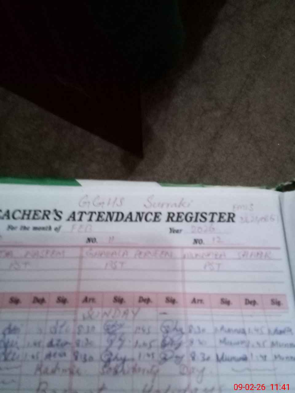 | Remarks (Use Separate Page if Required): gghs suraki Stutent on sis 176 student on register 176 head count 145 no teacher absent one on leave last visit aeo 30/1/26 non teacher ng staff required boundary wall need repair on immediate basis computer and school nce lab required play area need leveling nsb fund in very low | |||||
