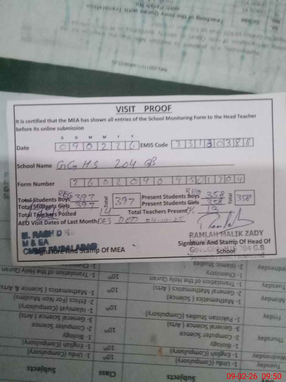 | Attendance Register | Head Teacher | MEA with School | Visit Proof |