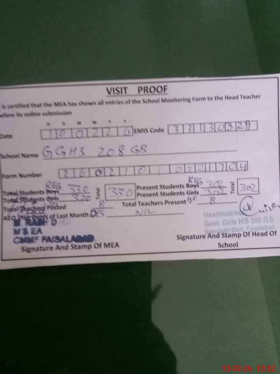 | EMIS Code: 33130329 | Name of School: GGHS CHAK NO.208/GB | |||