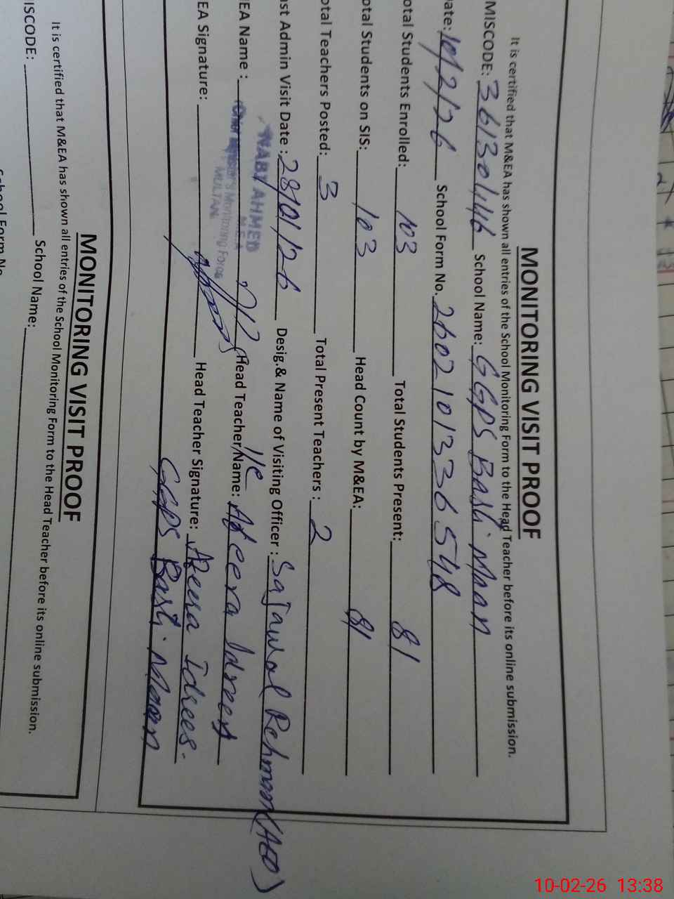 | EMIS Code: 36130446 | Name of School: GGPS BASTI MAAN WALA MULTAN | |||