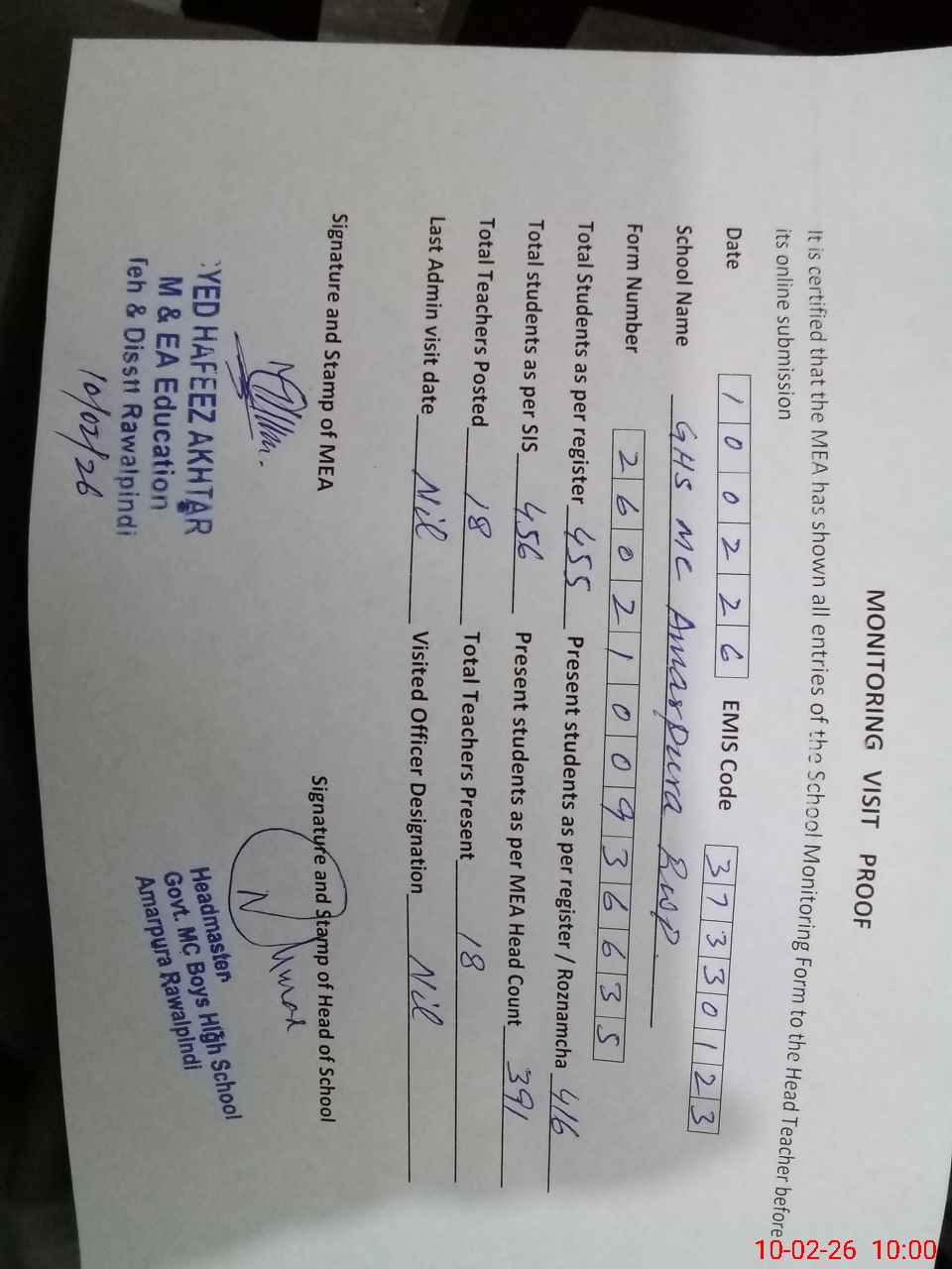 | Certified that this School was Inspected by the Undersigned MEA/DMO Today and the Information Stated Above is as Per Record. | |||||