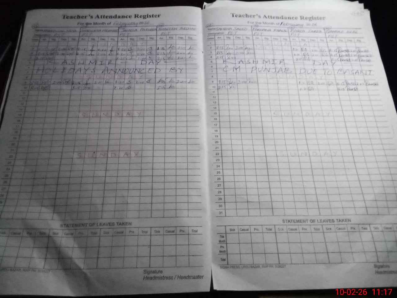 | 37**** | Fa**** Kh**** | PST Science/Maths | Regular | 0 | 0 | 0 | 0 | 0 | 0 | 0 | 0 | 0 | Maternity |