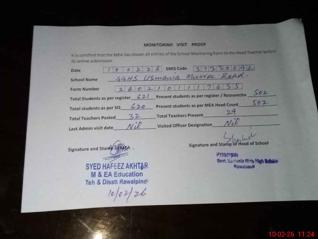 | Certified that this School was Inspected by the Undersigned MEA/DMO Today and the Information Stated Above is as Per Record. | |||||