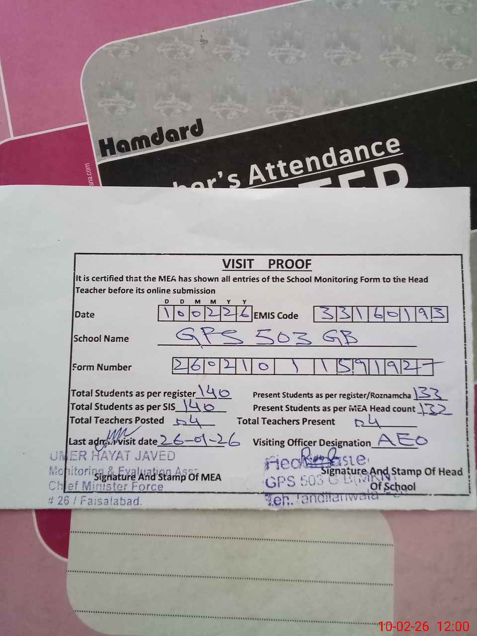 | Attendance Register | Head Teacher | MEA with School | Visit Proof |