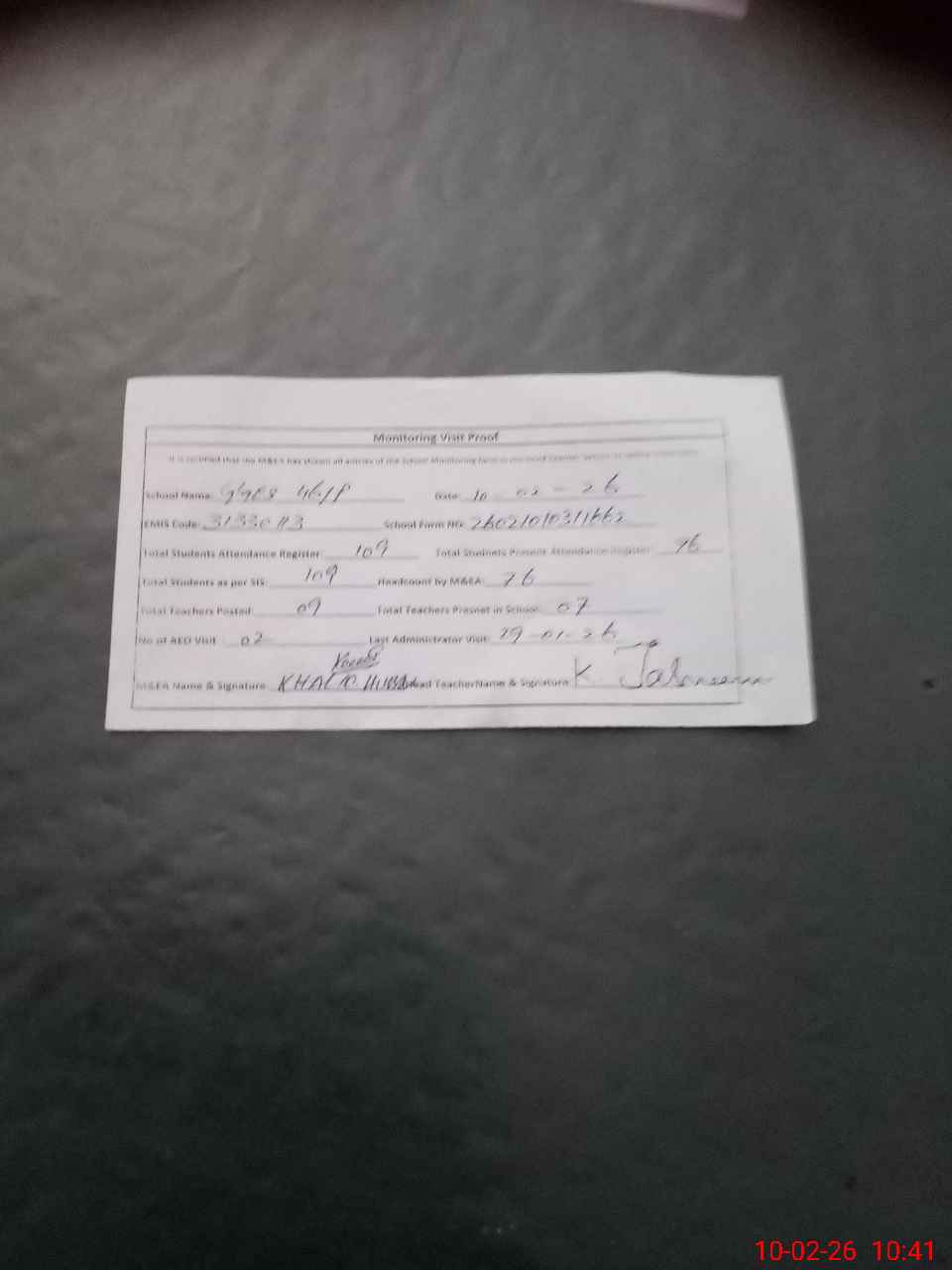 | Monitoring Date: 10-02-2026 | Start Time: 10-02-2026 10:01 AM | End Time: 10-02-2026 10:42 AM | Name of MEA: Kh**** Hu**** | |