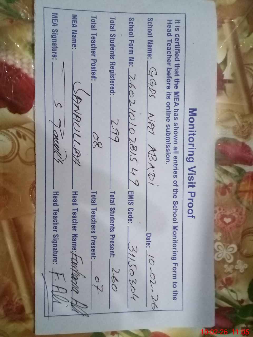 | Certified that this School was Inspected by the Undersigned MEA/DMO Today and the Information Stated Above is as Per Record. | |||||