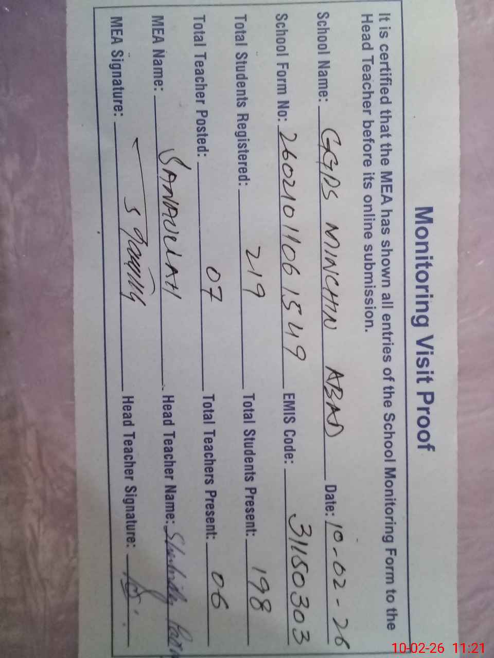 | Certified that this School was Inspected by the Undersigned MEA/DMO Today and the Information Stated Above is as Per Record. | |||||