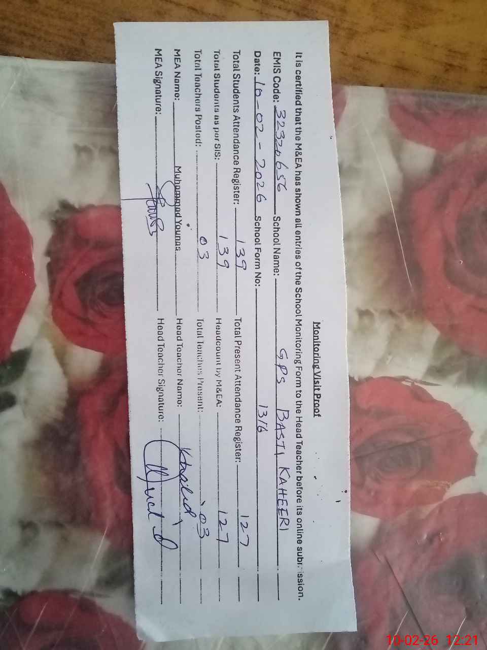 | Attendance Register | Head Teacher | MEA with School | Visit Proof |