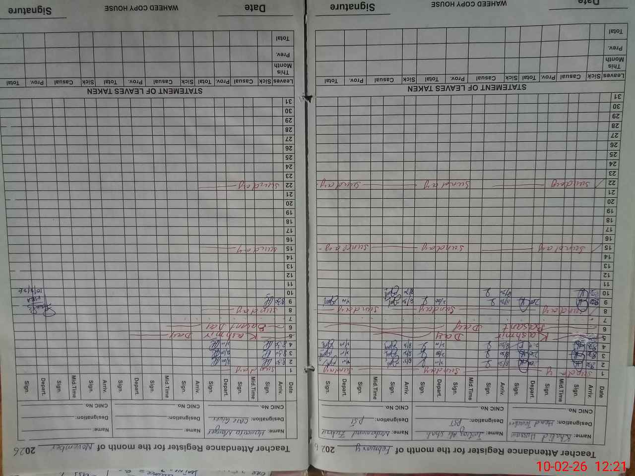 | CNIC | Full Name | Designation | R/C | Absence During Last Calender Month |