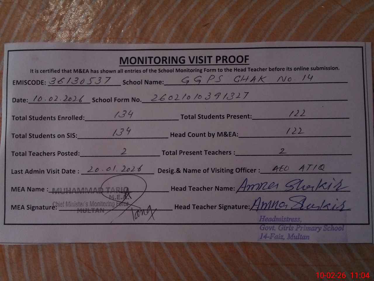 | Attendance Register | Head Teacher | MEA with School | Visit Proof |