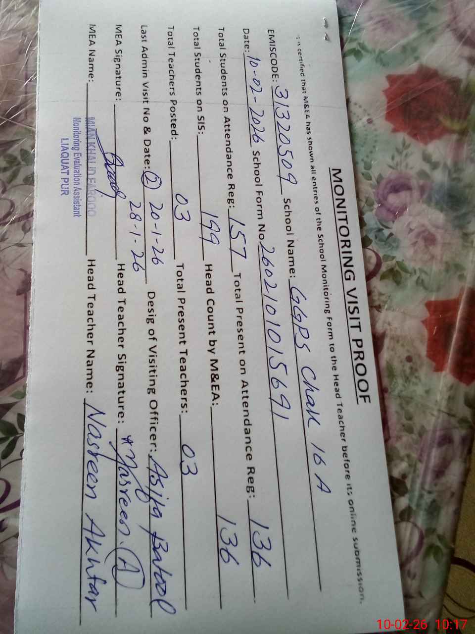 | EMIS Code: 31320509 | Name of School: GGPS CHAK NO.16/A | |||