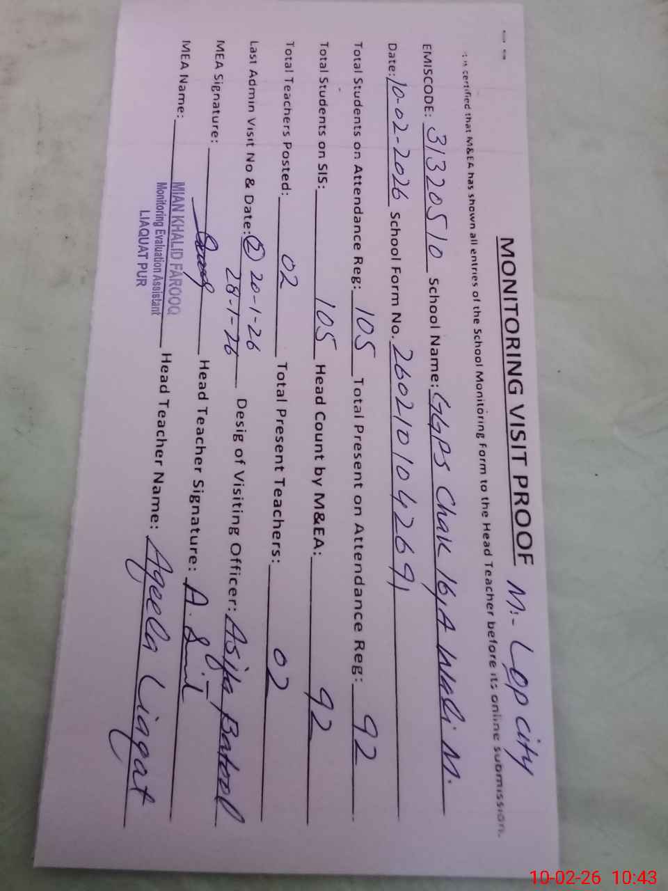 | EMIS Code: 31320510 | Name of School: GGPS CHAK NO.16/A BASTI WALI MUHAMMAD | |||