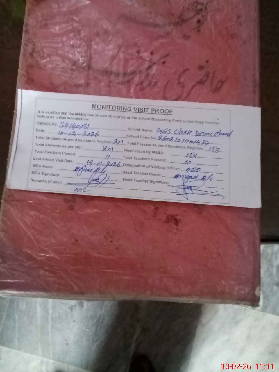| Certified that this School was Inspected by the Undersigned MEA/DMO Today and the Information Stated Above is as Per Record. | |||||