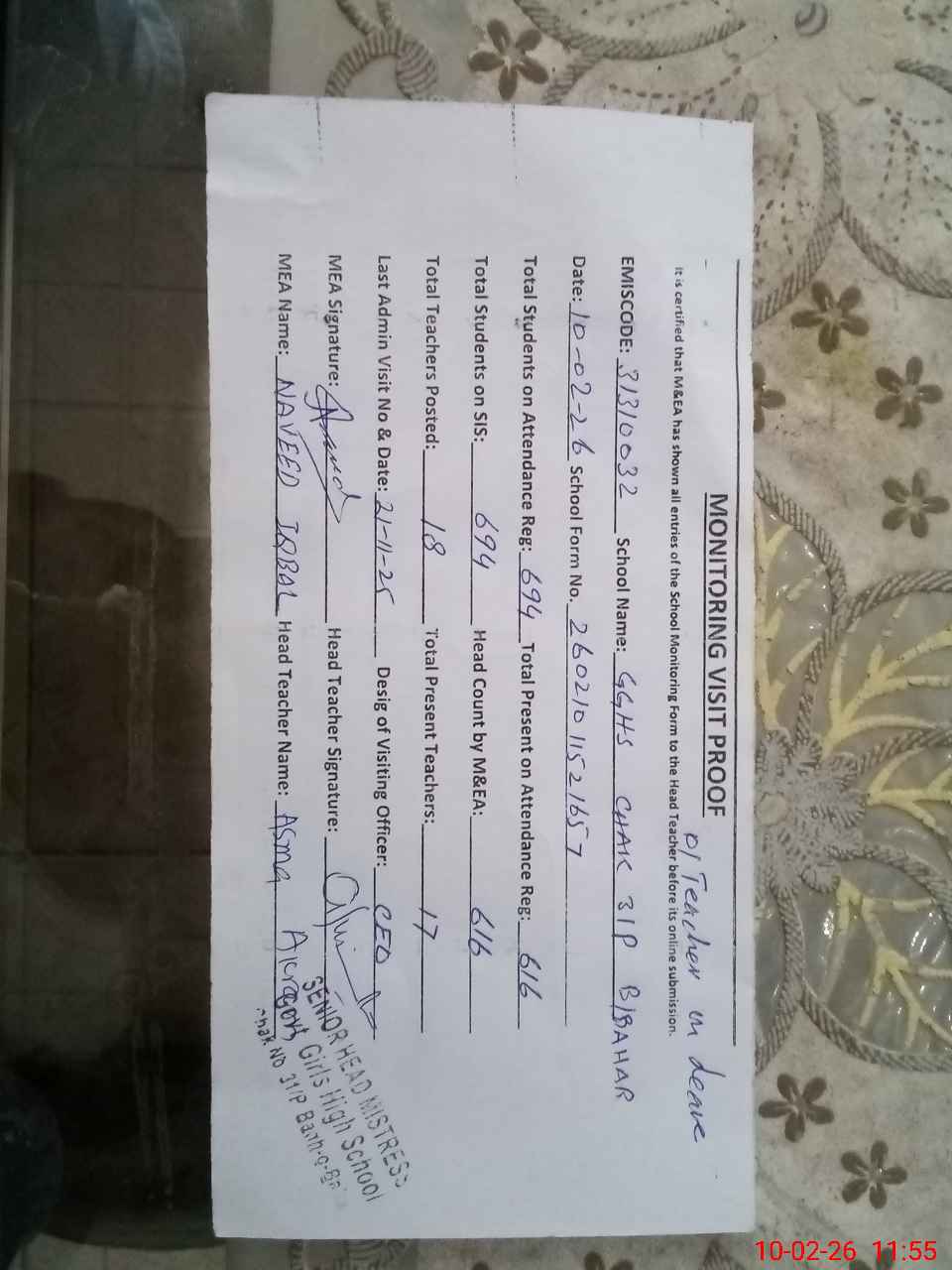 | EMIS Code: 31310032 | Name of School: GGHS CHAK NO. 31/P BAGHO BAHAR | |||