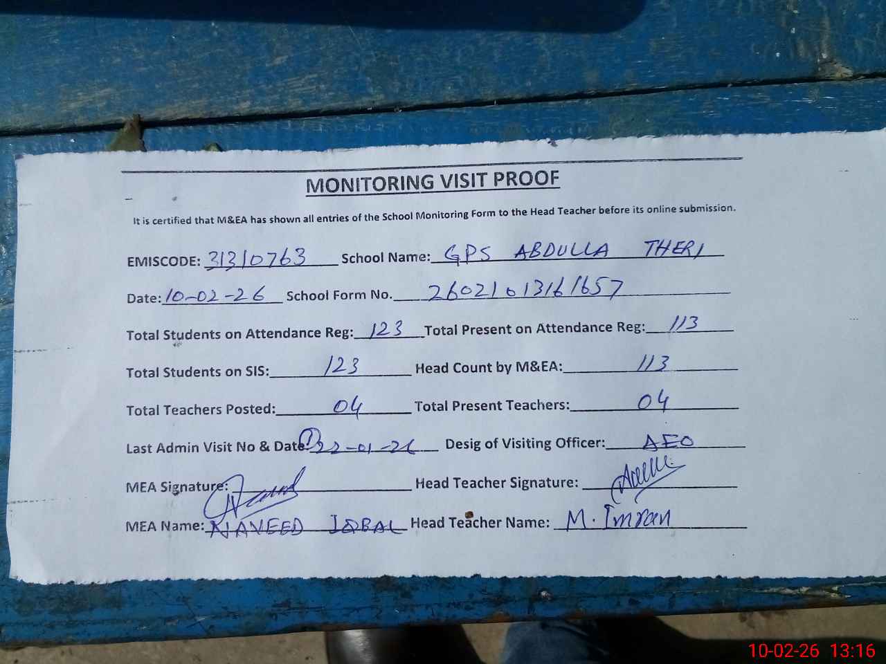 | EMIS Code: 31310763 | Name of School: GPS ABDULLAH THARI | |||