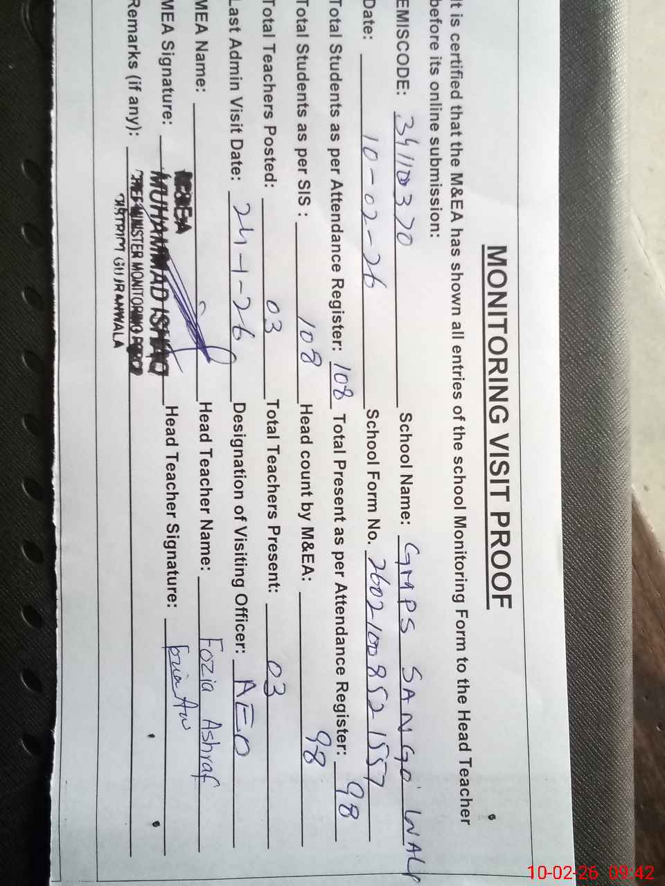 | Attendance Register | Head Teacher | MEA with School | Visit Proof |