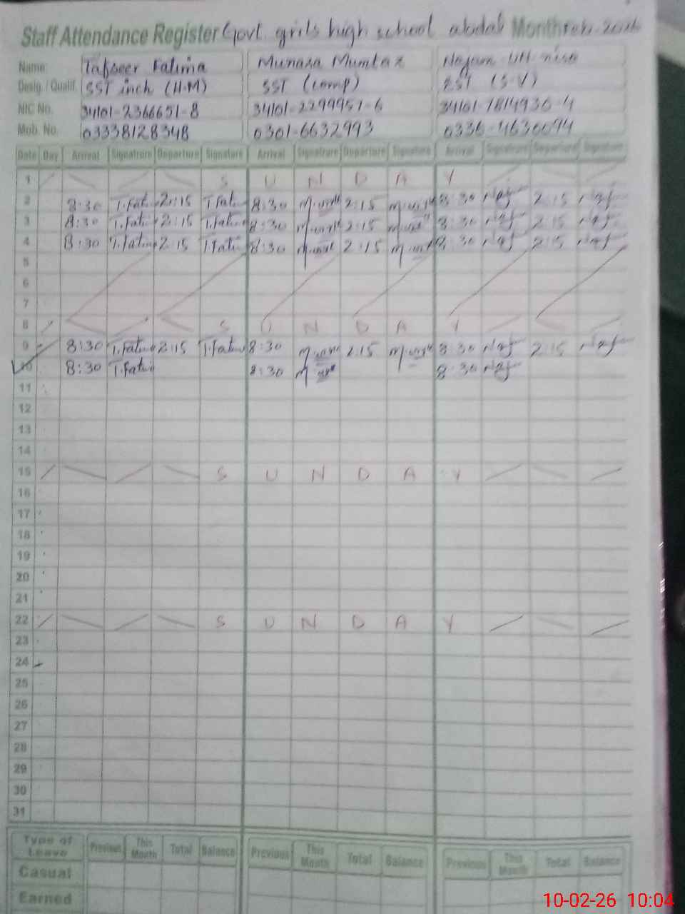 | Remarks (Use Separate Page if Required): PST ARBAB IS ABSENT FROM SCHOOL NO LEAVE RECORD FROM 14 AUGUST 25 EST MARIA GHAFOOR IS ABSENT FROM SCHOOL NO SECTION LEAVE RECORD FROM 12 JAN 26 But on attendance register said teacher on maternity leave STI AYESHA ZAFAR IS SERVING IN THIS SCHOOL | |||||